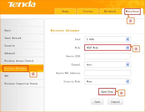 1. Click Wireless and then choose Wireless Extender, choose WISP mode. Click Open Scan.