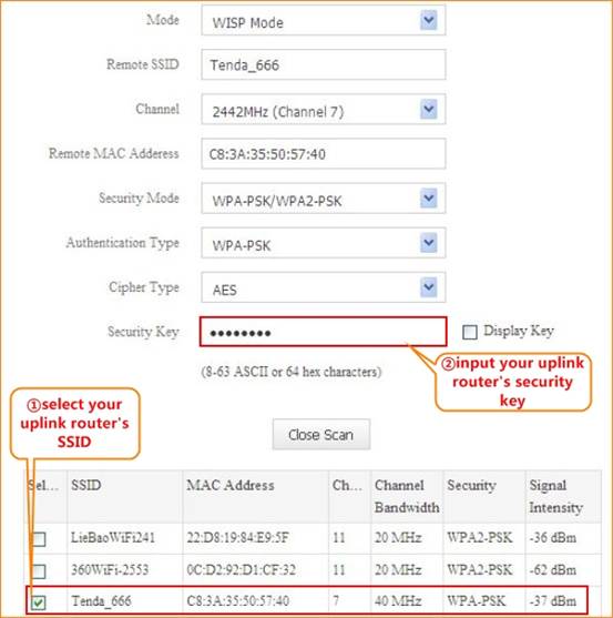 2.Select your uplink router’s SSID, and input your uplink router’s security key. then click Save to save the settings.