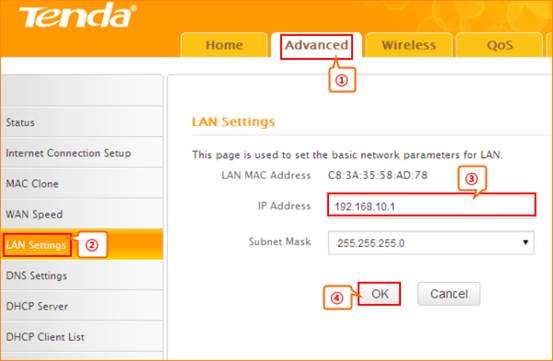 2. Click Advanced, and then click LAN Settings. Change your router’s LAN IP.(The LAN IP address should be in different network segment. For example, the uplink router has the LAN IP 192.168.0.1, then you can set the secondary router’s LAN IP as 192.168.10.1.)