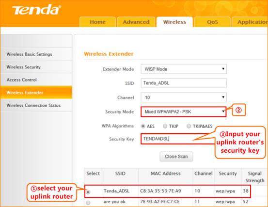 2.Select your uplink router’s SSID, and input your uplink router’s security key. then click Save to save the settings.
