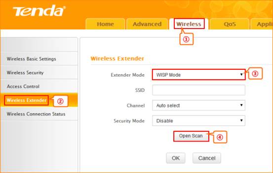 1. Click Wireless and then choose Wireless Extender, choose WISP mode. Click Open Scan.