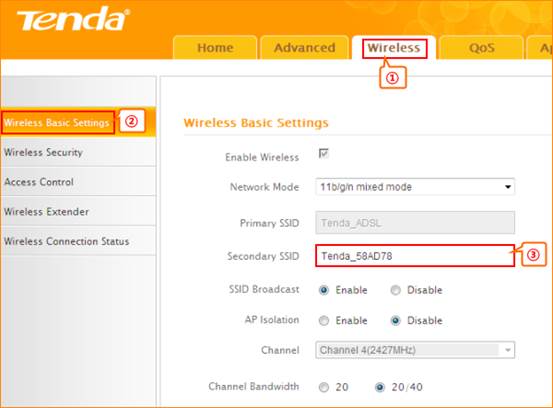 4.1 Click Wireless and Wireless Basic Setting, change secondary SSID, and then click OK to save the settings.
