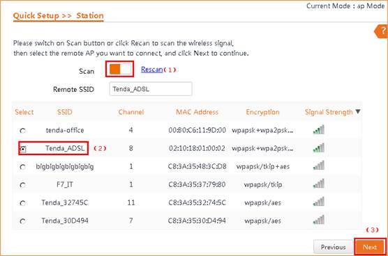 4 open Scan and choose the uplink router’s SSID, click Next.