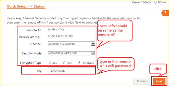 5 Confirm the remote AP’s info and type in the security key of the remote router. Then click Next.