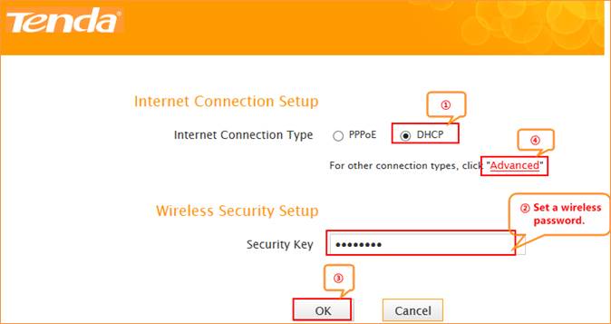 3 Choose the Dynamic IP option, then set a Security Key for the wireless security , then click on Save to save the settings, then click on Advanced.