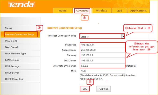 3 Click on the Advanced then click on the Internet connection setup option on the left of the page, then open the Dropdown Menu of the Connection Type then choose the Static IP option, after that type the accounts that provided by your ISP then click on OK to save the settings.