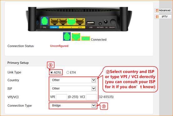 3.2 Choose ADSL, Country and ISP, If your country and or your ISP are not covered on the home page, select Other and configure the VPI and VCI value manually (If you do not know this information, ask your ISP to provide it), choose connection type as Bridge.