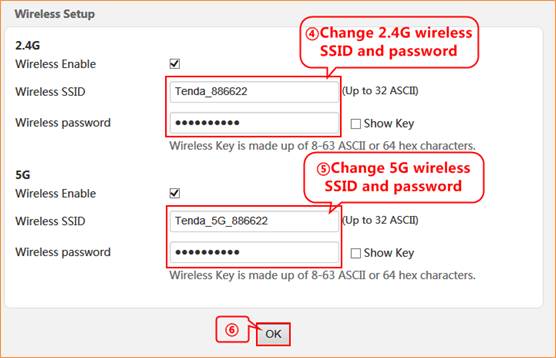 3.3 Change 2.4G/5G wireless SSID and wireless password as you want, and then click OK to save all the settings.