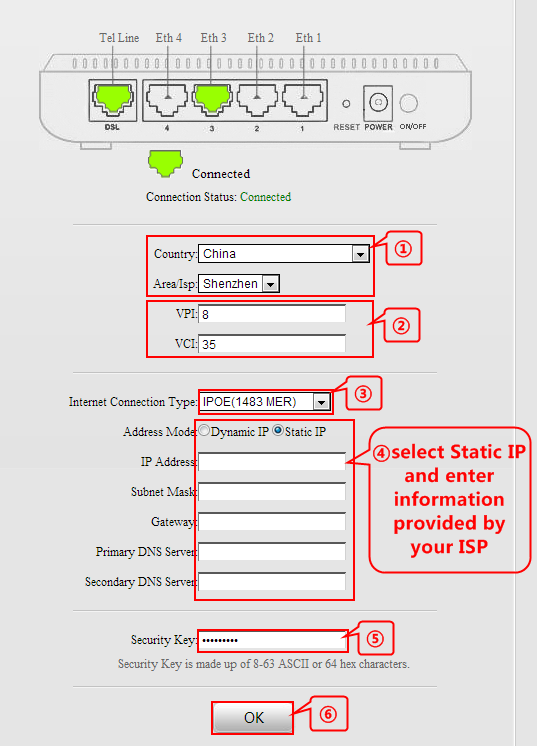 3.2 Choose country and ISP, If your country and or your ISP are not covered on the home page, select other and configure the VPI and VCI value manually (If you do not know this information, ask your ISP to provide it), choose internet connection type as IPOE, choose address mode as static IP, enter information provided by your ISP. Change WiFi security key as you want, and then click OK to save all the settings.