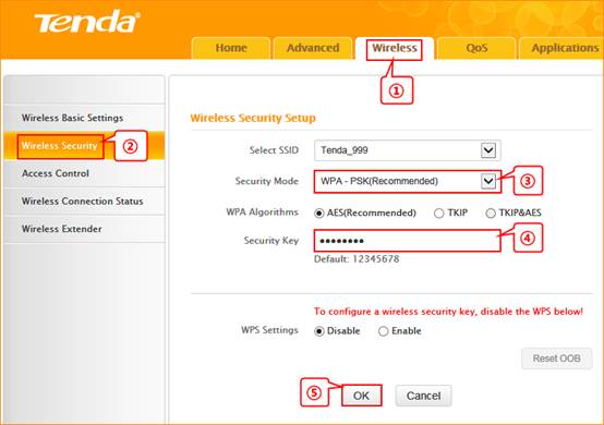 4. Click on wireless security, and choose WPA-PSK as the security mode and AES as the WPA Algorithms, and set a security key for R1, and then click OK to save all the settings.