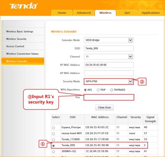 1. Click Wireless and Wireless Extender, choose WDS Bridge, click Open Scan, find and select the SSID of R1 to add its MAC Address, choose WPA-PSK as security mode and input R2’s security key. then click OK to save the settings.