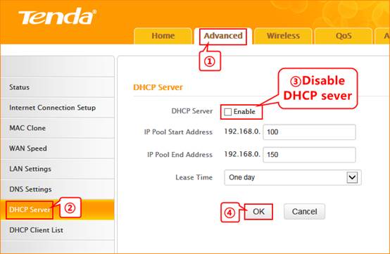 5. Go to DHCP Server to disable DHCP Server, then click OK to save the setting.