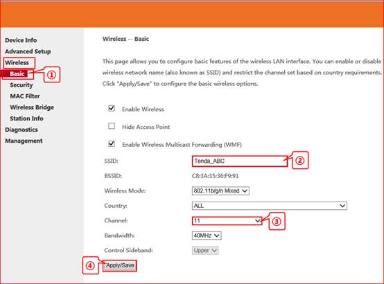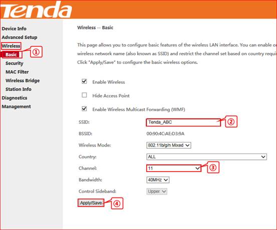 2. Wireless——Basic, change the SSID as Tenda_ABC(the same as R1’s SSID), select the channel as channel 11, click save.