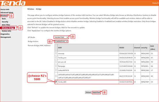 4. Click Wireless and then choose Wireless Bridge, choose Access Point as AP mode, and choose Enable (Scan) as bridge actions, choose R1’s SSID, click save.