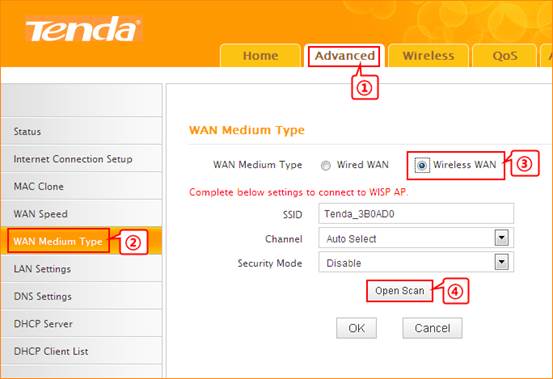 3.1 Click Advanced and then choose WAN Medium Type, choose Wireless WAN, Click Open Scan.