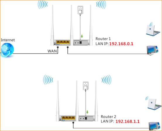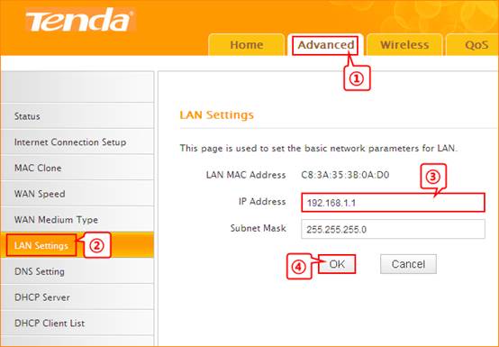 2.2 Click Advanced, and then click LAN Settings. Change your router’s LAN IP.(The LAN IP address should be in different network segment. For example, the router1 has the LAN IP 192.168.0.1, then you can set the router2’s LAN IP as 192.168.1.1.)