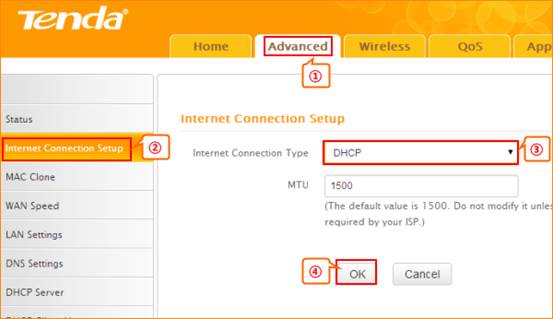 2.1 Click Advanced, then click Internet connection setup. Choose DHCP, click Save.