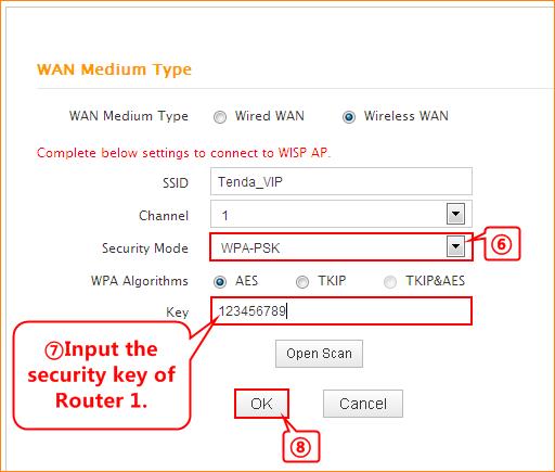 3.2 Select the Router1’s SSID, and input the router1’s security key. then click OK to save the settings.