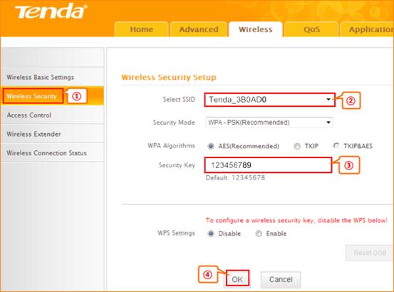4.2 Click wireless security key, select SSID which you have set as secondary SSID, choose the security mode as WPA-PSK, input your security key, and click OK to save all the setting.
