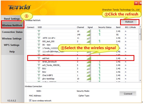 1. Click Refresh to upgrade the available wireless network list, select a desired wireless network and then click Connect.
