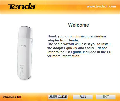 2. The driver will run automatically, and a welcome page will pop up, just click on “RUN” button (double click on “Tenda. exe” in the software CD and manually install if it is not auto-run).