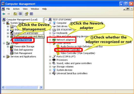 1. Right Click Computer->Management->Device Manager->Ethernet Controller.(Take Windows XP OS for example)