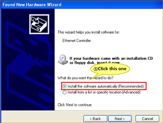 1. Here comes the dialog box Found New Hardware Wizard, select Install the software automatically (Recommend) and click Next.