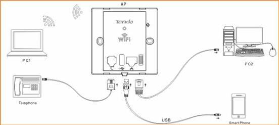 Power on the AP, and connect your PC to one of the LAN ports by a cable, as the following illustration;