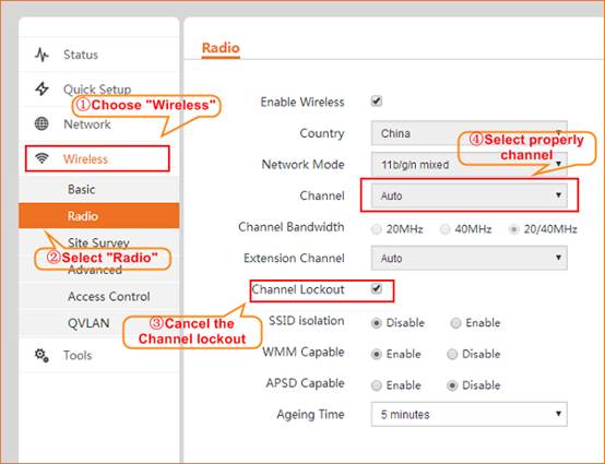 Select the “Radio” and uncheck the “Channel lockout”, then select a properly channel which suits your region.