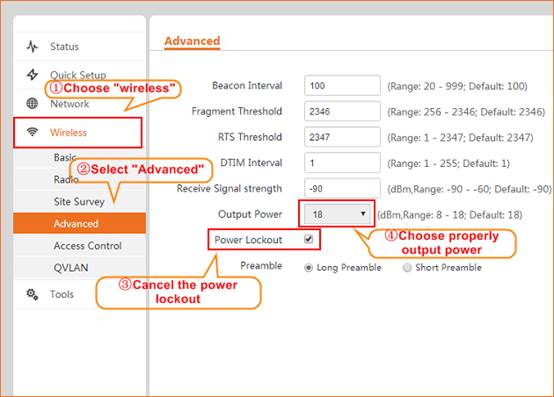 Select the “Advanced” and uncheck the “power lockout”, then set a custom output power dBm which fits your need.