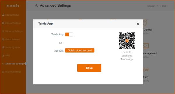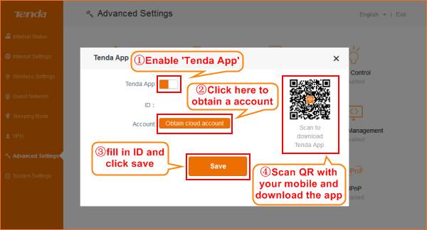 Step 3: Enable Tenda App function, use mobile phone or pad to scan QR code to download management APP, and register by mobile phone number or E-mail.