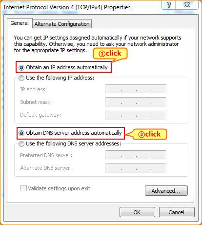 Choose Obtain an IP address automatically and Obtain DNS server address automatically and then click OK.