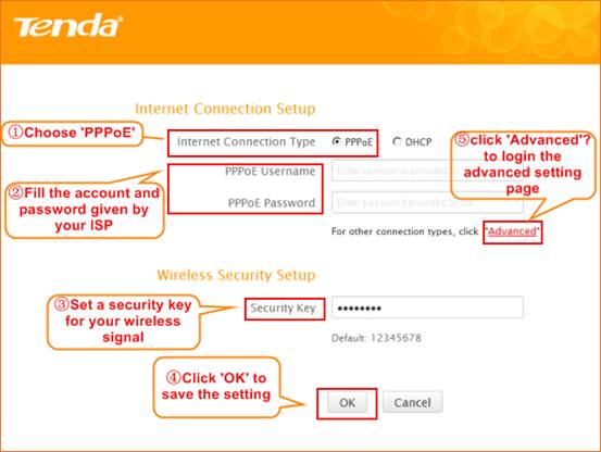 Choose the PPPOE option, then type the ISP Username and ISP Password in the correct bars, then set a 2.4G Security as you want, click OK to save the settings, then click Advanced to login the advanced setting page.
