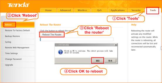 4 Click on Tools, then click on Reboot, and then press the Reboot The Router button to reboot the router for refreshing the device info.