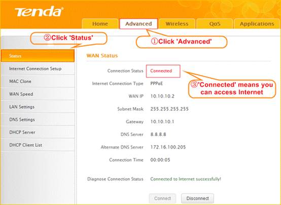 Type the User Name and Password as admin then Click on Advanced to login the advances setting page, and then check on the Status.