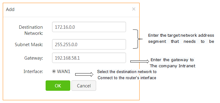 A company purchased a W15E enterprise router for network construction. The company Intranet and the Internet in different networks, the router has been connected to the Internet via WAN0 port, connecting the company Intranet server through WAN1.Now, the client that needs to implement the router needs to access the Internet and the Intranet at the same time. Setting static routing on the router can be achieved.