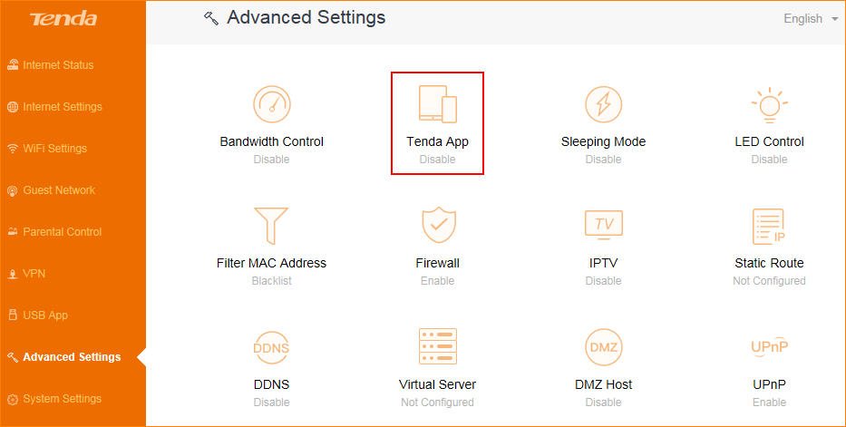 Method 2: Open a browser and enter “tendawifi.com” in the address bar to login router management. Tap “Advanced Settings” > “Tenda APP”: