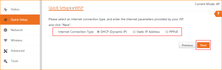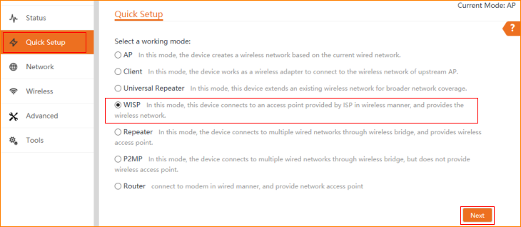 3.1 Click “Quick setup”, select “WISP”, and then click “Next”.