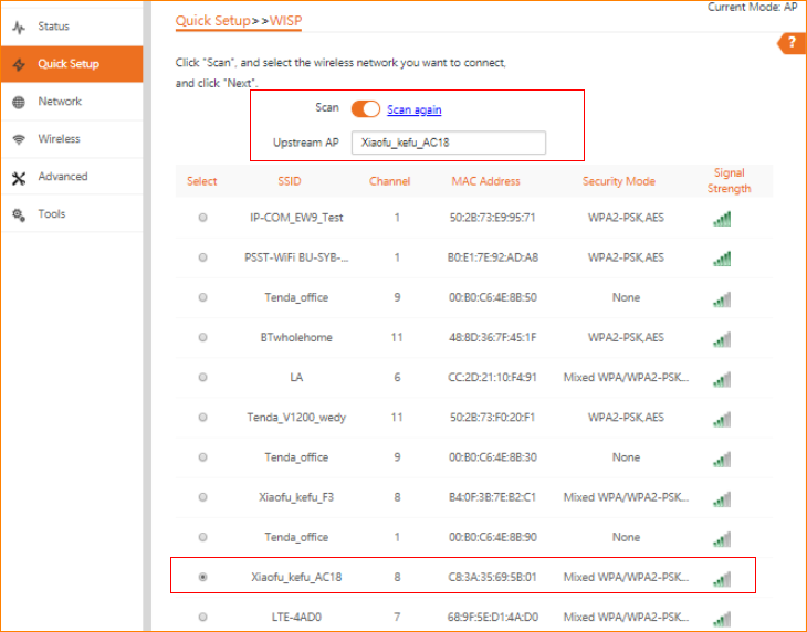 3.2 Click "Scan", and select the wireless network you want to connect, and click "Next".