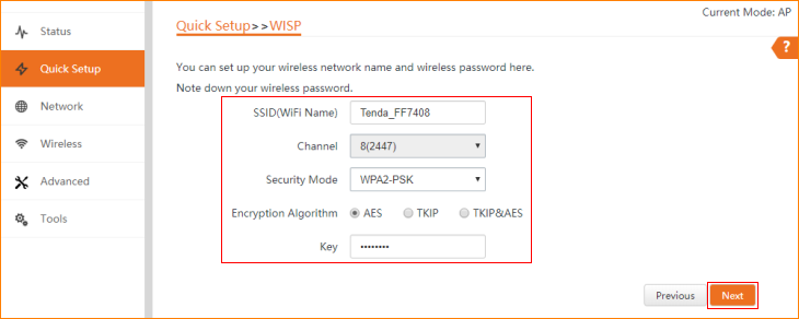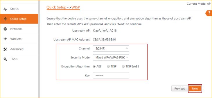 3.3 Ensure that the device uses the same channel, encryption, and encryption algorithm as those of upstream AP. Then enter the WiFi password of upstream AP, and click "Next" to continue.
