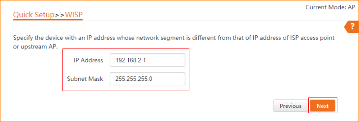 3.6 Specify the device with an IP address whose network segment is different from that of IP address of ISP access point or upstream AP. And then click “Next”.
