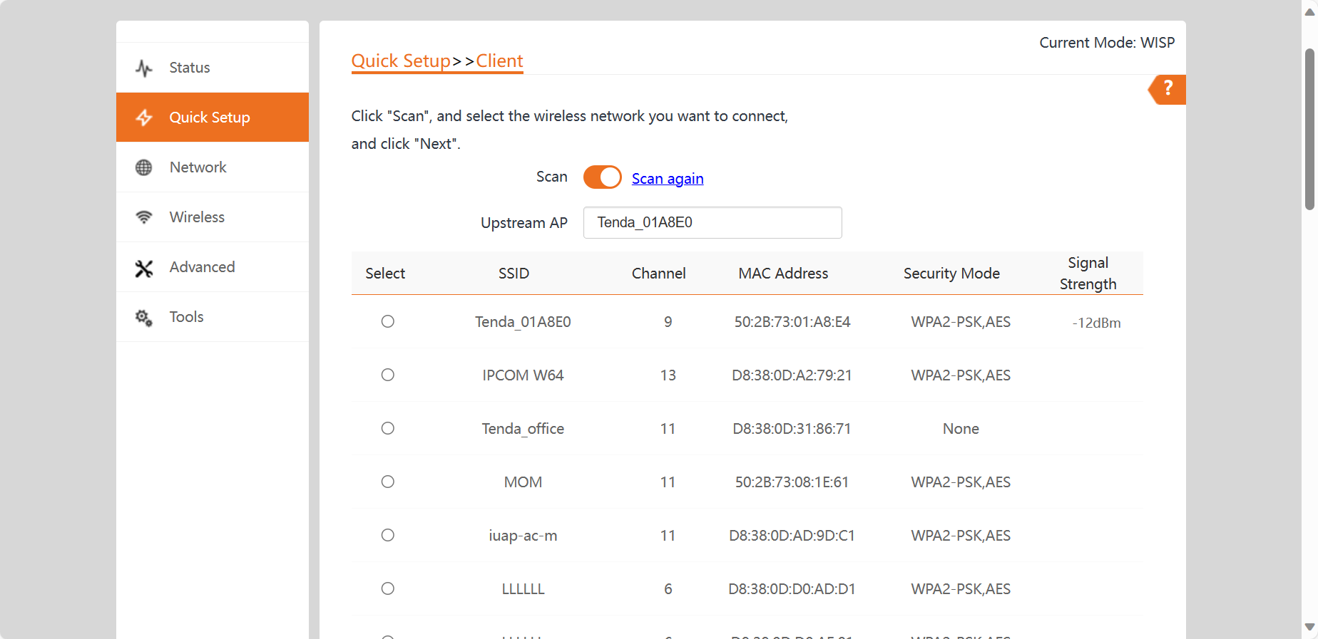 Step3: Click "Scan", and select the wireless network you want to connect,enter the password.
