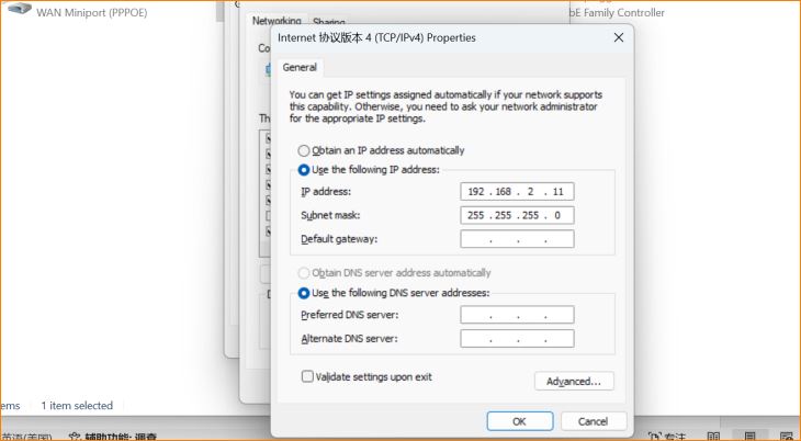 Step1:we should modify to the same network segment between CPE and PC. Click WLAN and go to properties>Internet Protocol Version 4 TCP/IPv4,change to Use the following IP address。Enter IP address 192.168.2.X, and Subnet mask :255.255.255.0. Save.