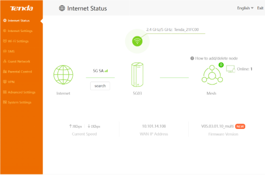 Make your own computer/mobile phone connected to 5G03 wirelessly, and then access the website by using the url labeled on 5G03, which is tendawifi.com (and normally this ip address, 192.168.0.1, is also able to access the website), and log in with your own username and password.