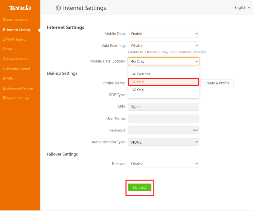 Step 2: If the Network Type is not on 4G, please confirm if the 4G signal in your area is strong or not, if so, please go to Internet Settings page, change Mobile Data Options from 4G Preferred to 4G Only, click Save.