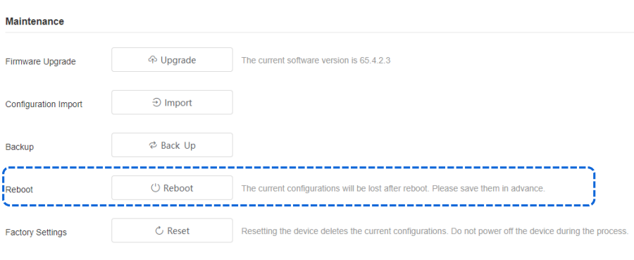 2.Click Device Settings > Maintenance > Maintenance to enter the page. On this page, you can click Reboot to restart the switch。