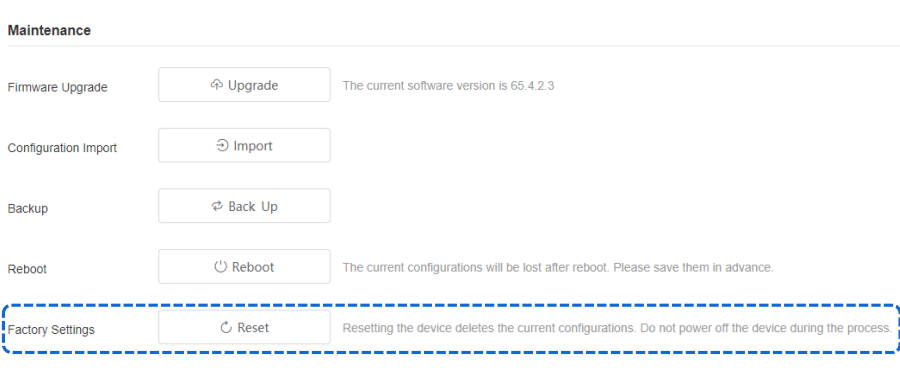 1. Click Device Settings > Maintenance > Maintenance to enter the page. On this page, you can click Reset to restore the switch to factory settings, and all configuration information will be removed.