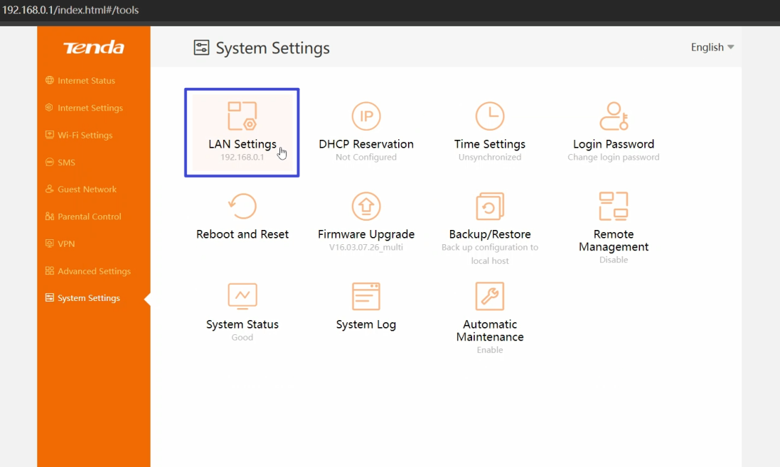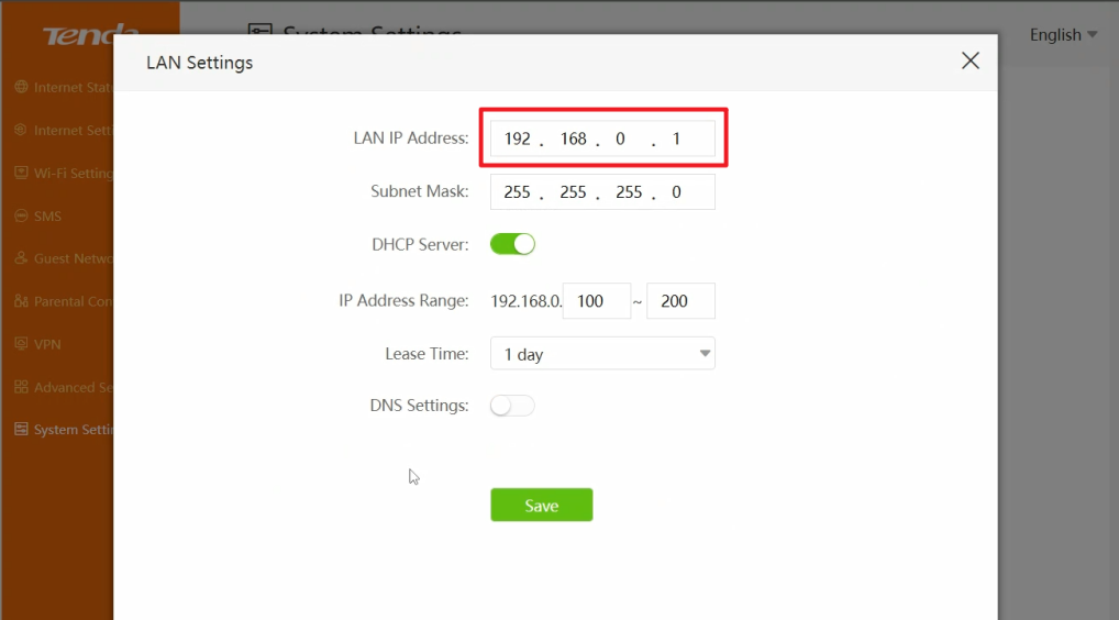 Change LAN IP Address to 192.168.0.1 and click Save.