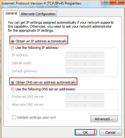 5.Choose Obtain an IP address automatically and Obtain DNS Server address automatically, then click OK, the previous page click OK.