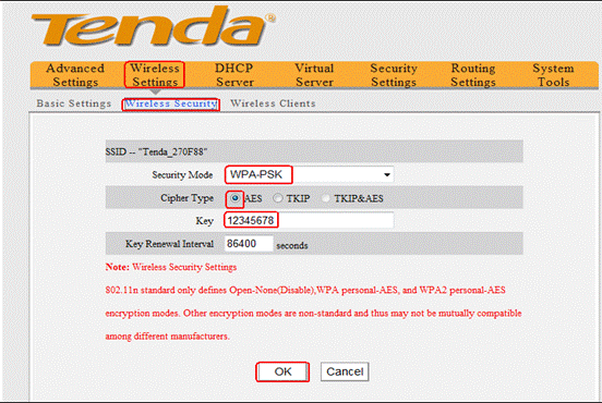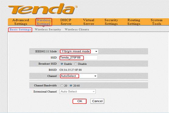 4Click on Wireless settings->basic settings, you can see the picture as below. Please choose 11b/g/n mixed mode, change the SSID to tenda123 (the name of wireless network) and choose channel 6, then click OK to save the settings.